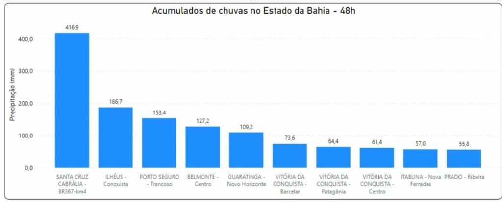 O acumulado de chuvas registradas nas últimas 48 horas em Santa Cruz Cabrália, no sul da Bahia, chegou a alcançar 416,9 milímetros, de acordo com dados divulgados na manhã deste sábado (21), pela Defesa Civil. Esse é o maior índice pluviométrico do estado, segundo o órgão.