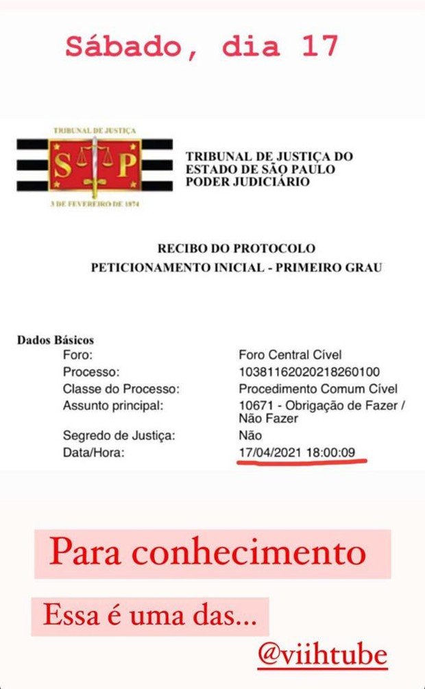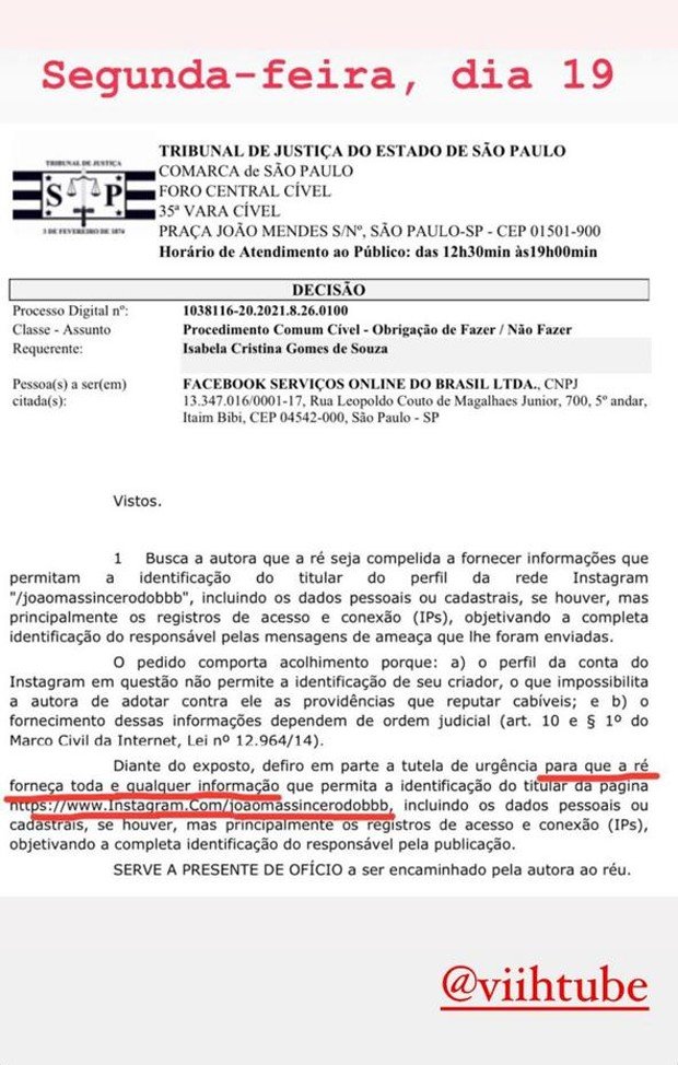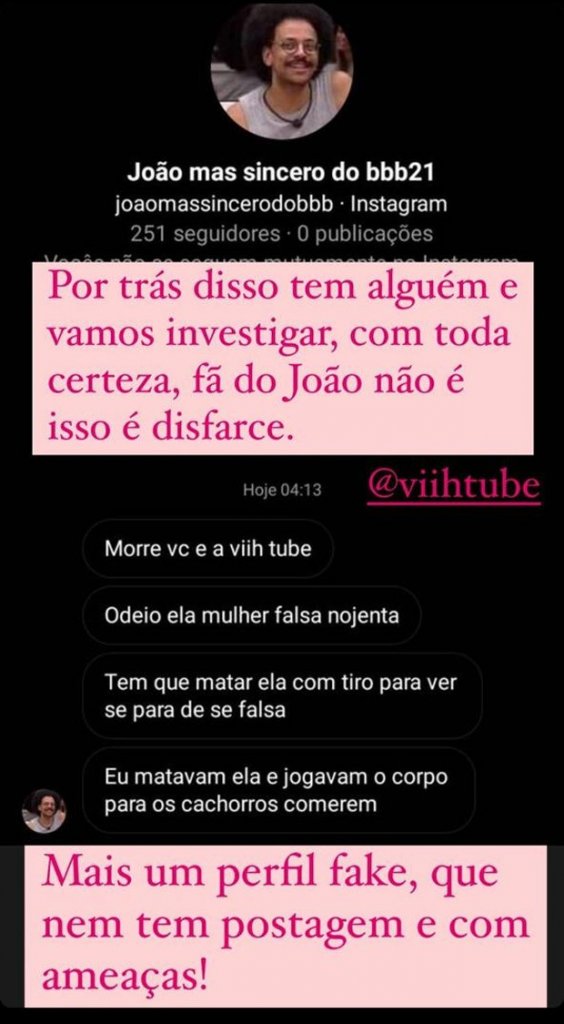 Que situação! Viviane Mara, mãe de Viih Tube, participante do BBB21, abriu um processo contra um perfil falso on Instagram após receber ameaças de morte. Nesta quarta-feira (21), ela publicou informações sobre o processo no Stories. "Por trás disso tem alguém e vamos investigar. Com toda certeza fã do João não é, é disfarce. Mais um perfil fake, que nem tem postagem e com ameaças", começou Viviane. Nas mensagens recebidas, a pessoa responsável pelo perfil escreveu: "Morre você e a Viih Tube. Odeio ela, mulher falsa, nojenta. Tem que matar ela com tiro para ver se para de ser falsa. Eu matava ela e jogava o corpo para os cachorros comerem."