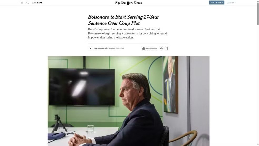 •The New York Times: o jornal americano afirmou que Bolsonaro cumprirá pena por liderar uma “conspiração fracassada” para se manter no poder.