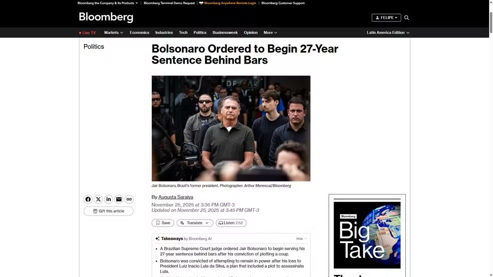 •Bloomberg: a agência americana afirmou que a medida do STF consolida uma “queda dramática” do ex-presidente.