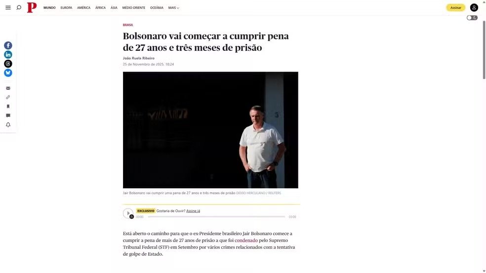 •Público: o jornal português classificou o julgamento como “histórico”, destacando que Bolsonaro se tornou o primeiro ex-presidente brasileiro condenado por tentativa de golpe.