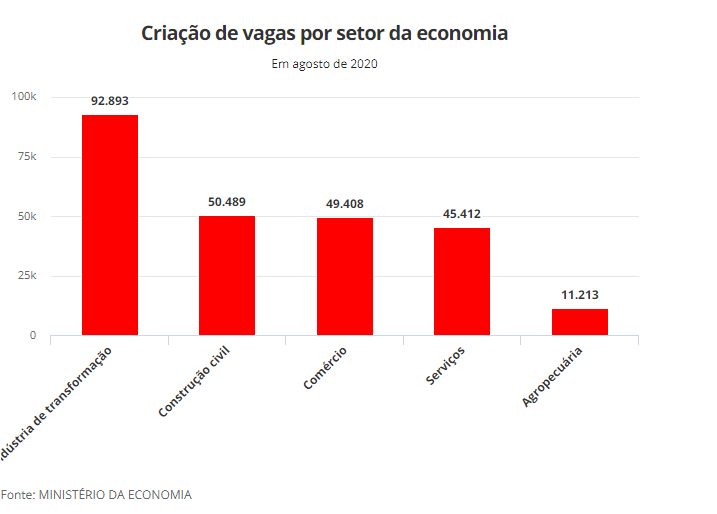 Em agosto, ainda segundo a pasta, foram contratados 1.239.478 trabalhadores formais, e demitidos 990.090. Esse foi o segundo mês consecutivo de geração de empregos formais e, também, o melhor resultado para meses de agosto desde 2010 ou seja, em dez anos. Ainda segundo a pasta, as demissões refletem o impacto da pandemia da Covid-19, doença causada pelo novo coronavírus, no mercado de trabalho brasileiro, que empurrou a economia mundial para uma forte recessão. Em agosto, os setores que geraram mais empregos formais foram: