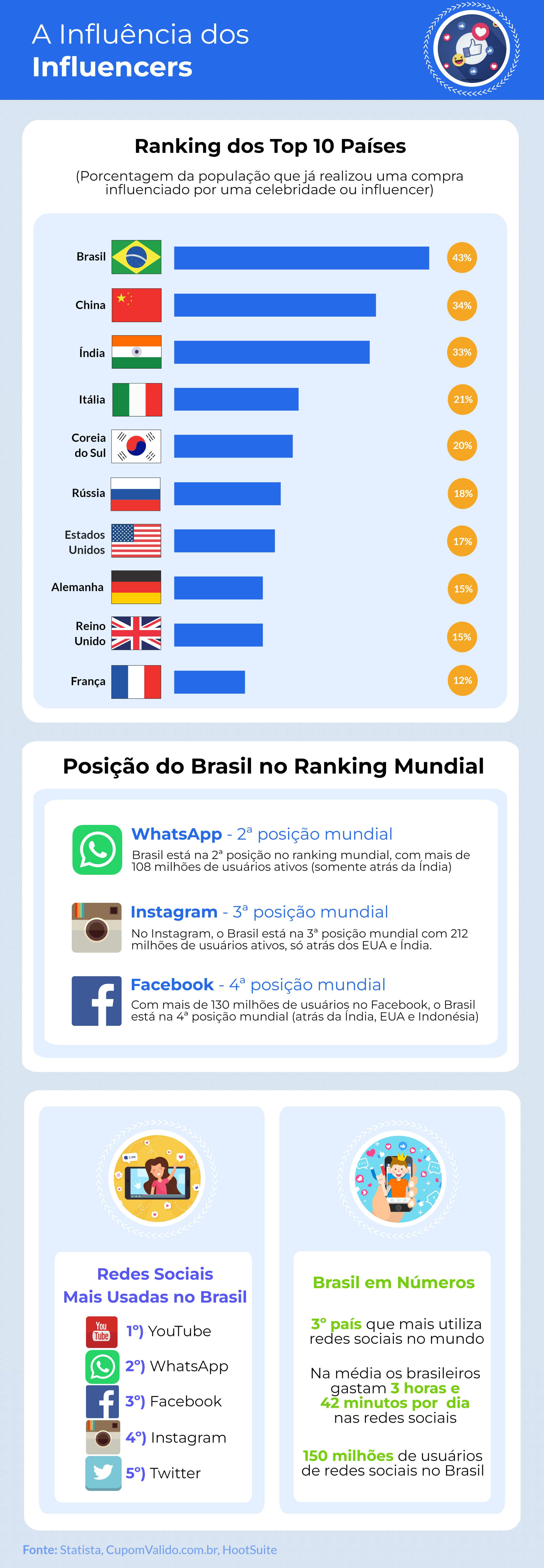 Porém, no caso do Brasil, este número é ainda maior. O país é o primeiro no ranking mundial em que os influencers são mais relevantes para a decisão de compra online.