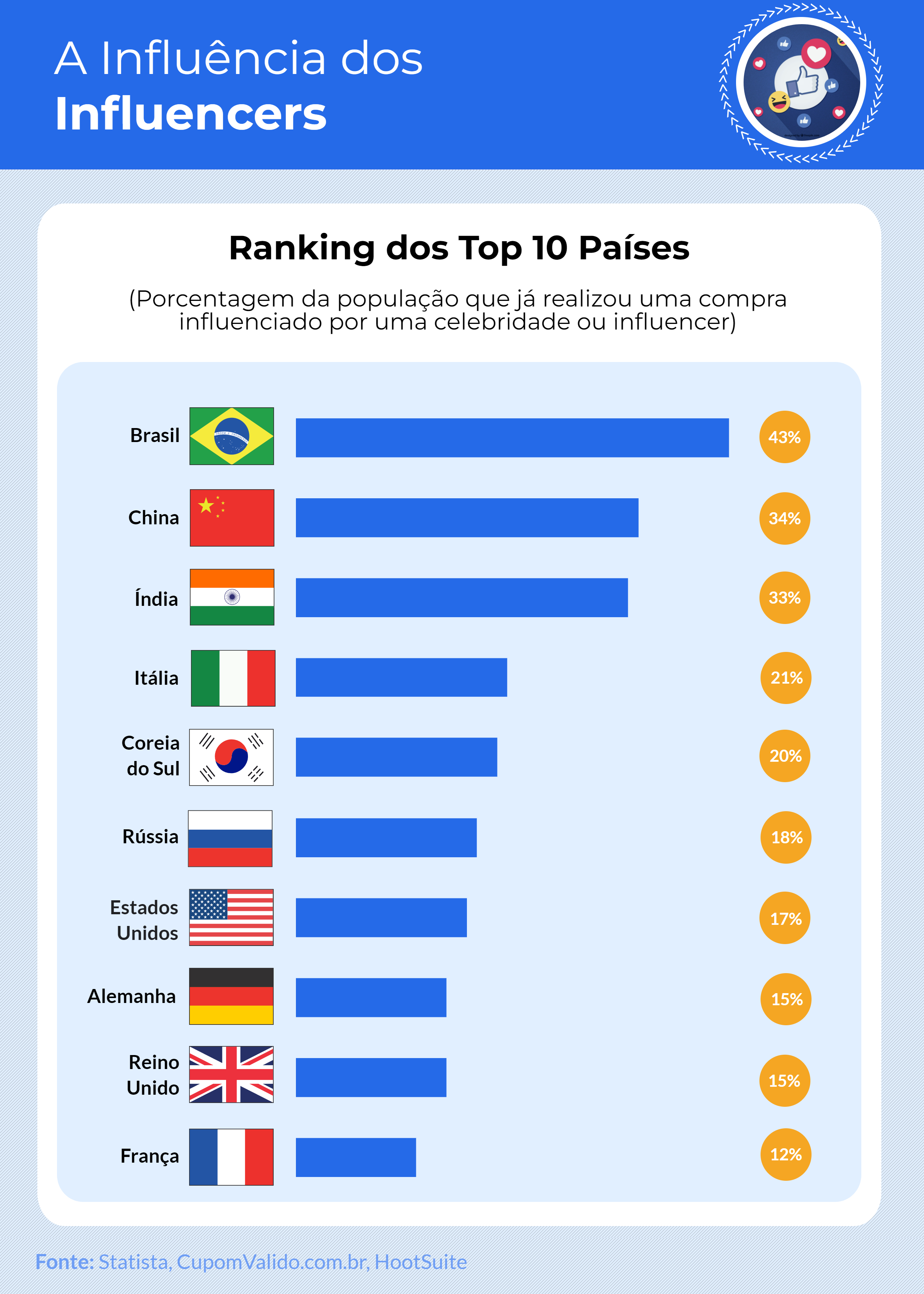 O Brasil segue disparado na primeira colocação, onde 43% da população já realizou uma compra com base num influencer.