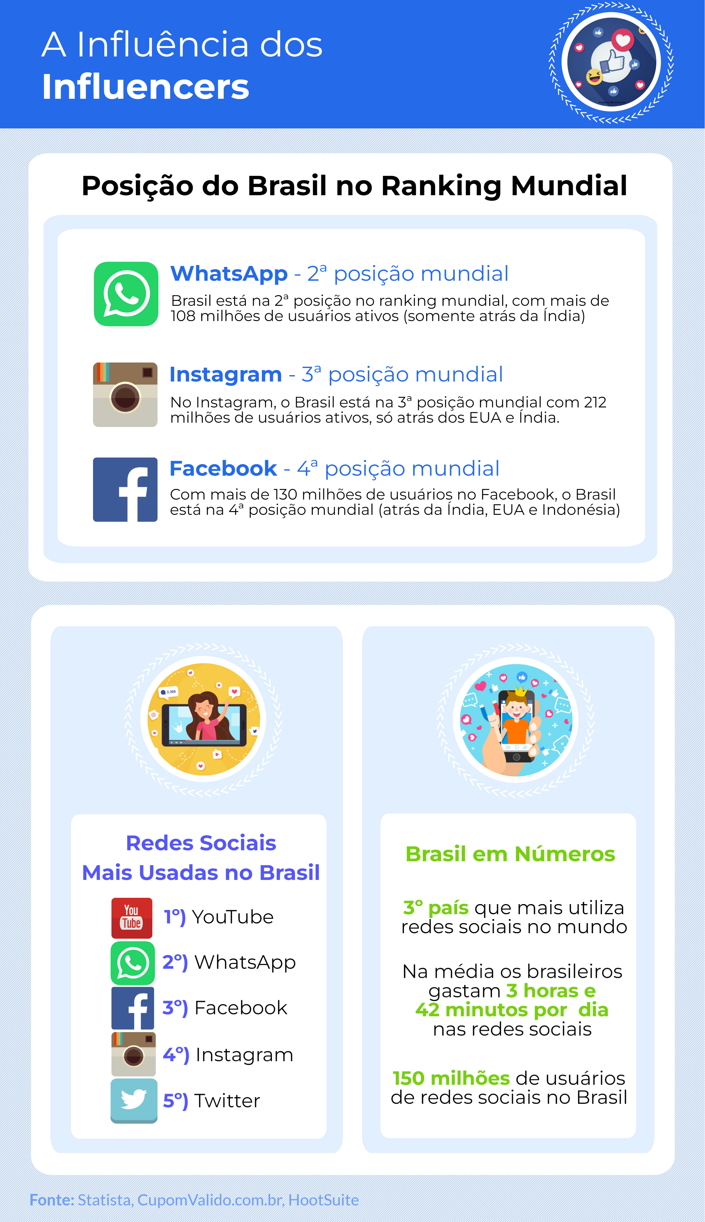 É o que releva um estudo da plataforma de cupons CupomValido.com.br com dados da Statista e HootSuite sobre o poder dos influencers.