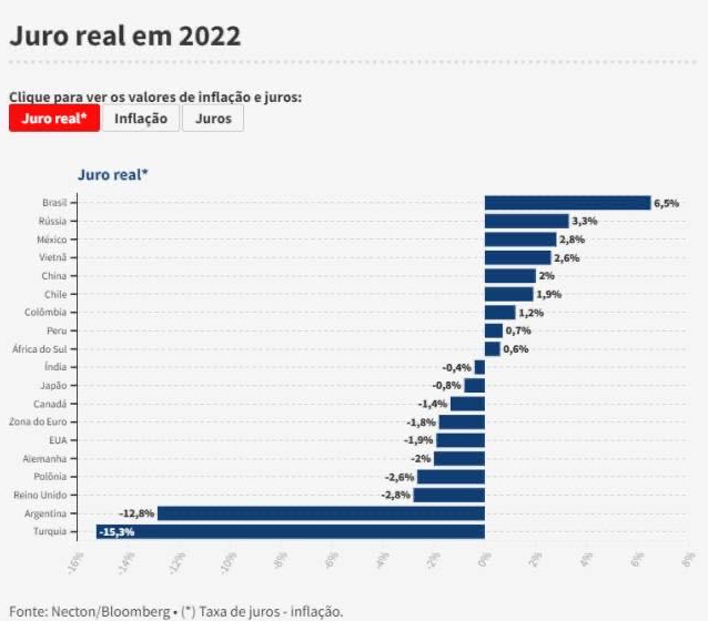 Um levantamento feito pela Necton Investimentos, do BTG Pactual, aponta que, apesar de ter uma das maiores taxas de juros do mundo, o Brasil pode terminar 2022 liderando também o chamado "juro real". Nesse caso, se desconta a perda pela inflação. Atualmente, a taxa de juros real brasileira projetada para o fim deste ano está na casa dos 6,5%.