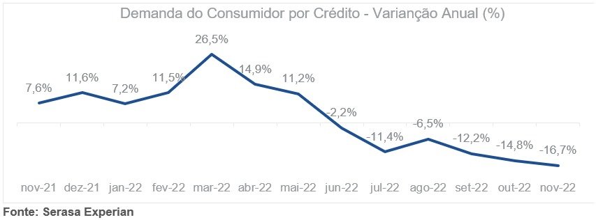 De acordo com o Indicador de Demanda dos Consumidores por Crédito da Serasa Experian, em novembro, a procura pelo recurso caiu 16,7% na comparação com o mesmo mês do ano anterior. Essa foi a queda mais expressiva de 2022, superando a registrada em outubro, de 14,8%.