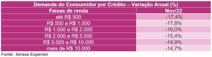 Os dados mostram que todas as faixas de renda tiveram diminuição na procura pelo recurso financeiro em novembro. Os consumidores que recebem entre R$ 500 e R$ 1.000 mensais foram os que menos buscaram por linhas de crédito, com queda de 17,8%.