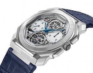 Mais recentemente, em 2020, a Bulgari seguiu com suas façanhas no campo da finura horológica com um sexto recorde mundial consecutivo alcançado pelo Octo Finissimo Tourbillon Chronograph Skeleton Automatic. Seu movimento de esqueleto de corda automática com um cronógrafo monopusher e funções de turbilhão está alojado dentro de uma espessura de apenas 3,5 mm. Esta destilação de virtuosidade técnica e design ultra-moderno é apresentada em uma nova e preciosa interpretação da platina. Sua caixa de 43 mm, complementada por uma coroa de ouro branco e cerâmica, emoldura um elegante mostrador aberto com dois contadores cronógrafos cinzentos, revelando inteiramente o calibre interno esqueletizado BVL 388 e seu turbilhão às 6 horas. O mostrador do relógio é movido por ponteiros azuis que combinam com a pulseira de couro de alligator fixada por uma fivela de platina.