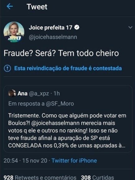 "Fraude? Será? Tem todo cheiro", escreveu a candidata em resposta a uma apoiadora que questionava o desempenho eleitoral dos candidatos na cidade de São Paulo. Joice não apresentou nenhuma prova de fraude e nenhuma investigação sugere esta possibilidade.
