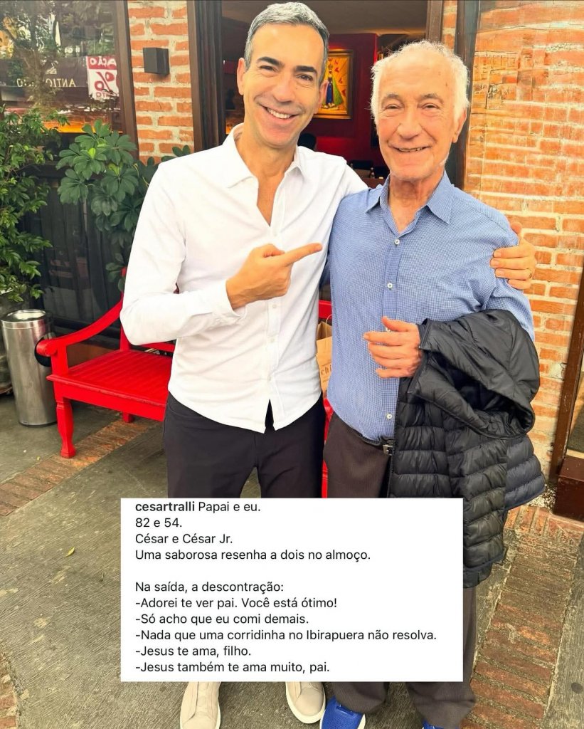 César Tralli encantou os fãs ao publicar um clique raro ao lado do pai, César, de 82 anos, durante um passeio neste sábado (15). O apresentador do Jornal Nacional compartilhou a troca entre os dois e divertiu seguidores.
