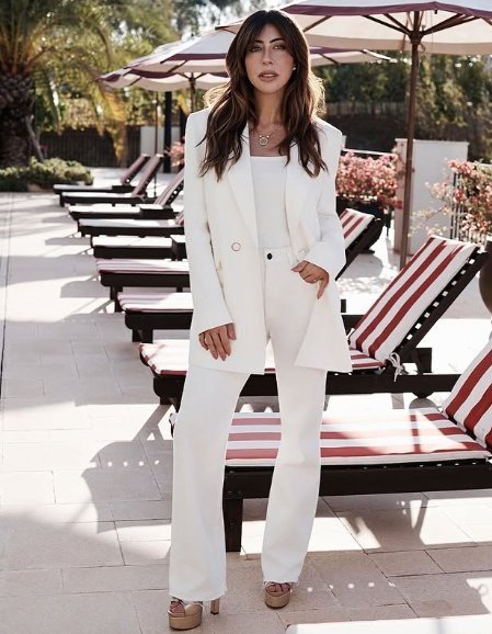 A principal aposta para valorizar o “Cloud Dancer” é o visual monocromático. O tom pode surgir em tecidos fluidos, alfaiataria leve e peças minimalistas, criando um efeito sofisticado e moderno. Ideal para ocasiões diurnas, eventos ao ar livre e até propostas urbanas com um toque chic.