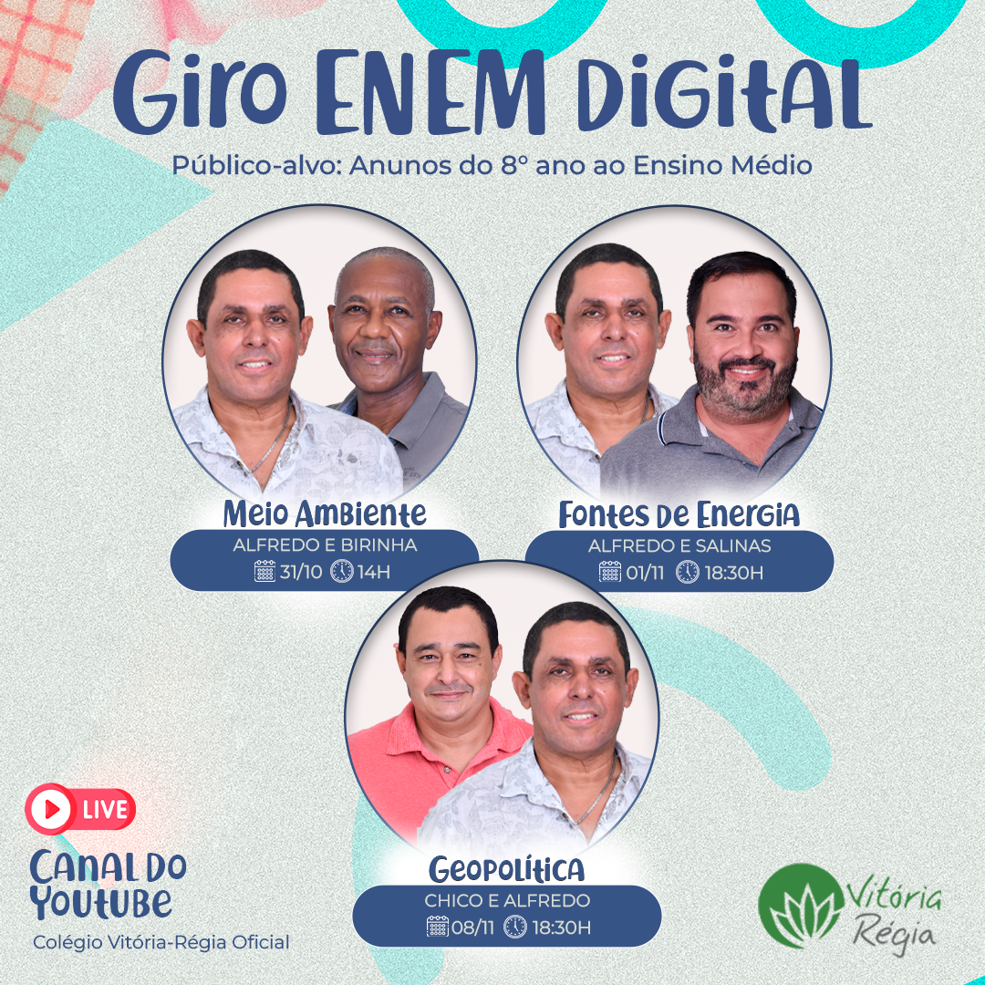 Nos dias 13 e 20 de novembro de 2022 estudantes de todo o Brasil vão realizar as provas do Exame Nacional do Ensino Médio (Enem). Pensando nisso, o Colégio Vitória-Régia está realizando revisões de conteúdo, voltadas não somente aos estudantes da instituição como também para o público externo. Para participar, basta acessar o canal do YouTube Vitória-Régia Oficial e conferir as transmissões virtuais. Nesta terça-feira, dia 01/11, o tema da vez é Fontes de Energia, e, no dia 08/11, Geopolítica, sempre às 18h30.