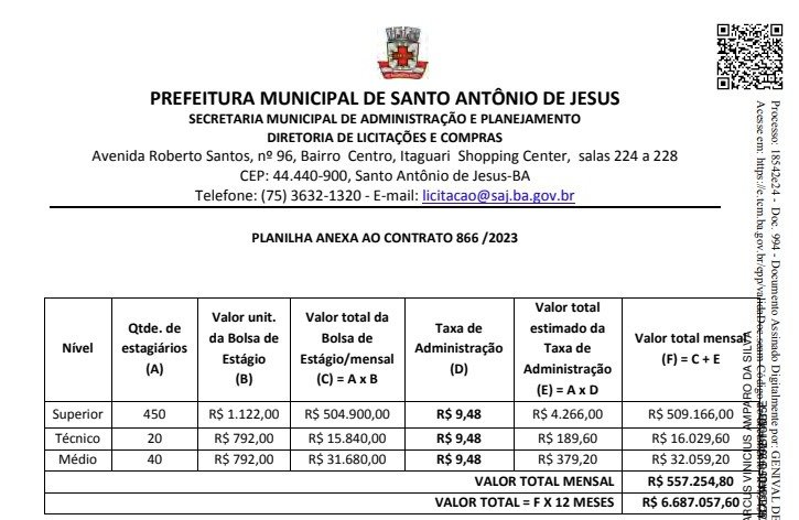 O documento, vigente até novembro deste ano, indica que o valor mensal estimado da contratação, considerando o salário mínimo e o vale-transporte, é de R$ 557,2 mil, totalizando exatos R$ 6.687.057,60 ao longo de 12 meses.
