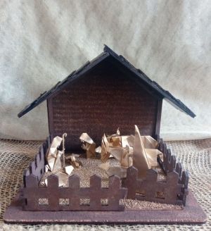 O presépio de Origami é pintado em dourado, acompanha a casinha de MDF, com telhado de papelão. Possui 12 cm de altura e 17 cm de largura.