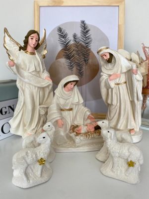 Feito de gesso na cor bege com detalhes em dourado, esse presépio é composto por oito peças de 30 cm cada.