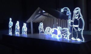 O presépio 3D acompanha base em MDF e é composto por 9 personagens mais a estrela-guia, todos com iluminação em LED (possui cabo de energia).