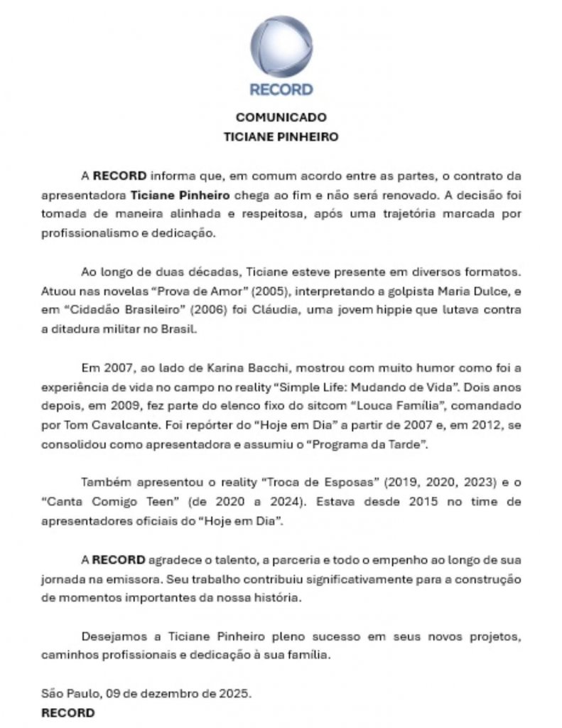 Ticiane Pinheiro não faz mais parte do time da TV Record. Em comunicado divulgado nesta terça-feira (9/12), a emissora afirma que o contrato foi encerrado “de maneira alinhada e respeitosa, após uma trajetória marcada por profissionalismo e dedicação”. “A Record informa que, em comum acordo entre as partes, o contrato da apresentadora Ticiane Pinheiro chega ao fim e não será renovado. A decisão foi tomada de maneira alinhada e respeitosa, após uma trajetória marcada por profissionalismo e dedicação”, diz a nota.