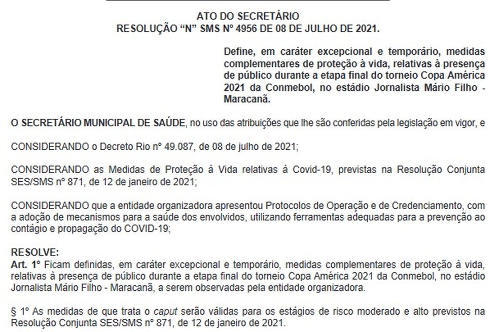 A Prefeitura do Rio de Janeiro liberou a participação de público no estádio do Maracanã na final da Copa América. A presença dos torcedores, no entanto, está limitada a 10% da capacidade do estádio. O jogo acontece no sábado (10).