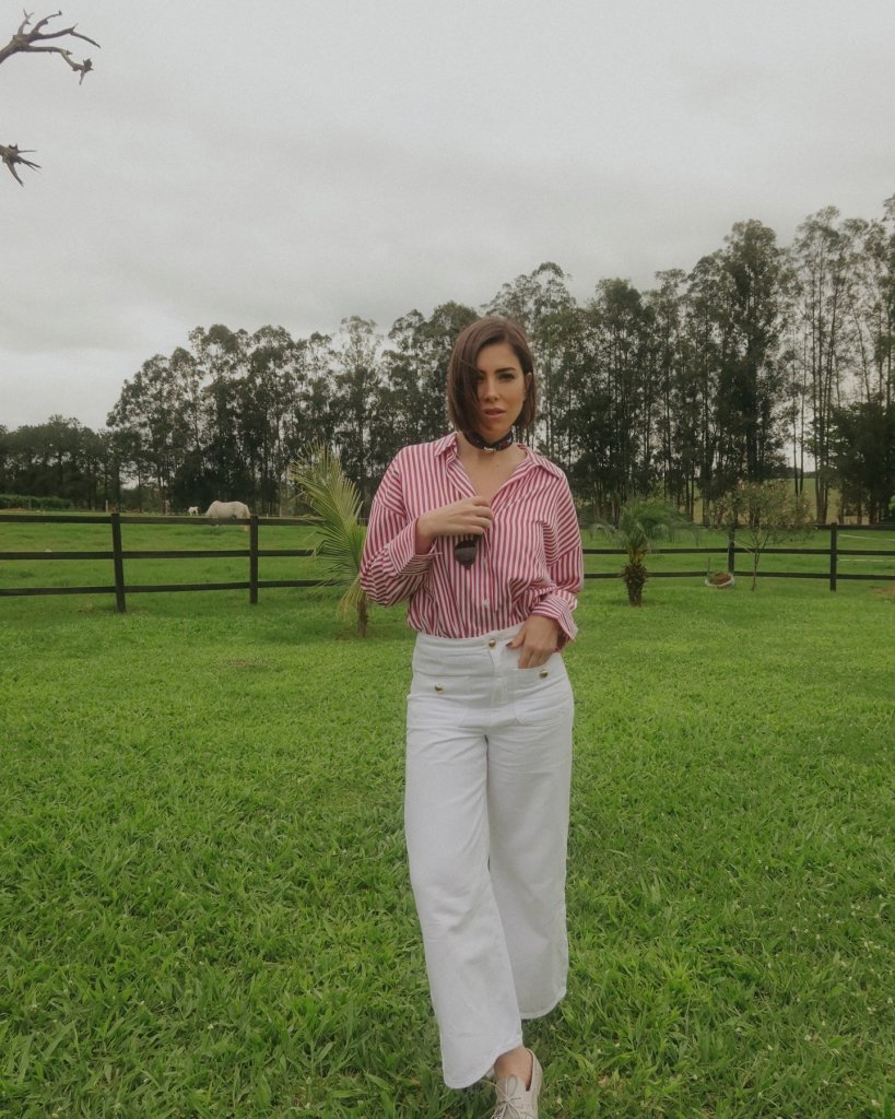 Elementos do estilo preppy também marcam presença dentro da estética campestre e as camisas listradas são um ótimo exemplo disso. Versáteis e atemporais, elas transitam facilmente entre o rústico e o sofisticado, funcionando em produções mais despojadas, com leggings e botas de montaria, e em looks elegantes com jeans e calças de linho. Uma dica de styling interessante é apostar em modelagens oversized, que adicionam modernidade a composição e compõem silhuetas diversas: como terceira peça, com alguns botões abertos, ou de maneira tradicional, para dentro da calça, por exemplo.