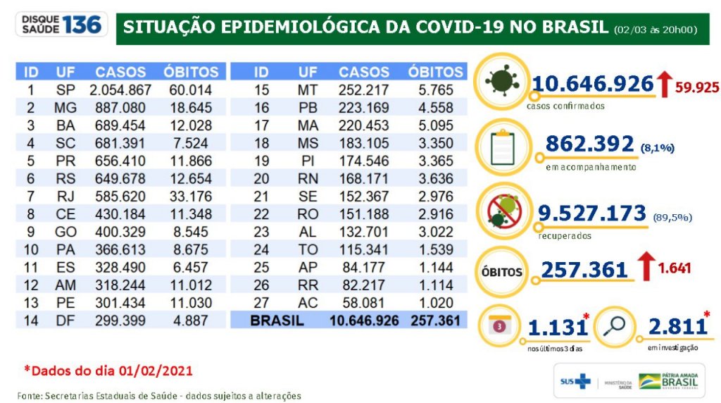 Dentro do mesmo período, mais 59.925 casos foram registrados no país. No total, são 10.646.926 infectados. Ainda segundo o Ministério, 9,5 milhões de pessoas já estão recuperadas da doença e 862.392 seguem em acompanhamento.