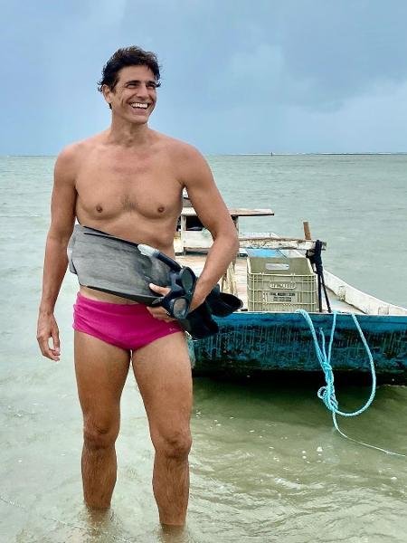 De sunga rosa, Reynaldo Giannechinni curte praia de Alagoas