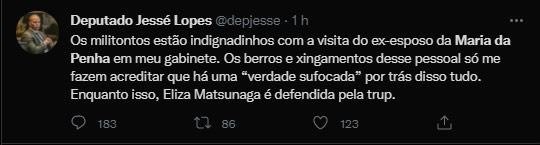 "Os militontos estão indignadinhos com a visita do ex-esposo da Maria da Penha em meu gabinete. Os berros e xingamentos desse pessoal só me fazem acreditar que há uma “verdade sufocada” por trás disso tudo. Enquanto isso, Eliza Matsunaga é defendida pela trup.", afirmou. O deputado apagou a postagem.