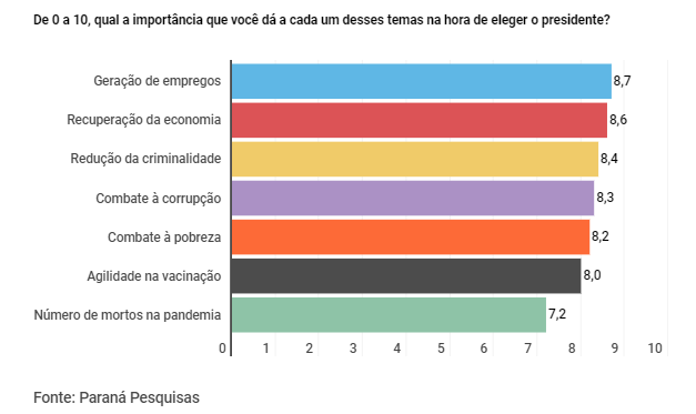 Uma pesquisa feita pelo instituto Paraná Pesquisas, entre os dias 25 e 29 de junho de 2021, mostrou que o desempenho da economia será o fator essencial para definir a eleição presidencial de 2022. No levantamento, os brasileiros apontaram numa escala de 0 a 10, qual era a importância que se daria a sete temas na hora de escolher o presidente da República.