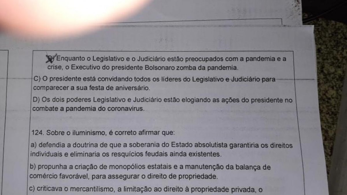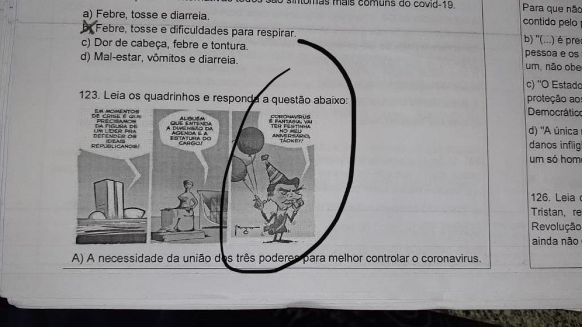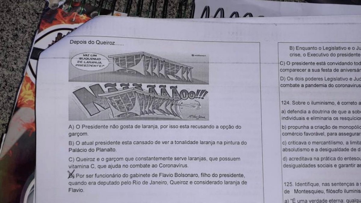Em uma das atividades, uma charge chega a citar o caso Queiroz, que é suspeito de envolvimento no suposto esquema de "rachadinhas" no gabinete do, na época, deputado Flávio Bolsonaro, filho do presidente da República. Além desta, outras questões sugerem críticas a atuação de Bolsonaro frente à pandemia. Em uma outra charge, Bolsonaro aparece vestido como "palhaço" e caracteriza a pandemia como "fantasia". Outra questão diz que o presidente "zomba" da situação "enquanto o Legislativo e o Judiciário estão preocupados com a pandemia e a crise". [confira as imagens na galeria]