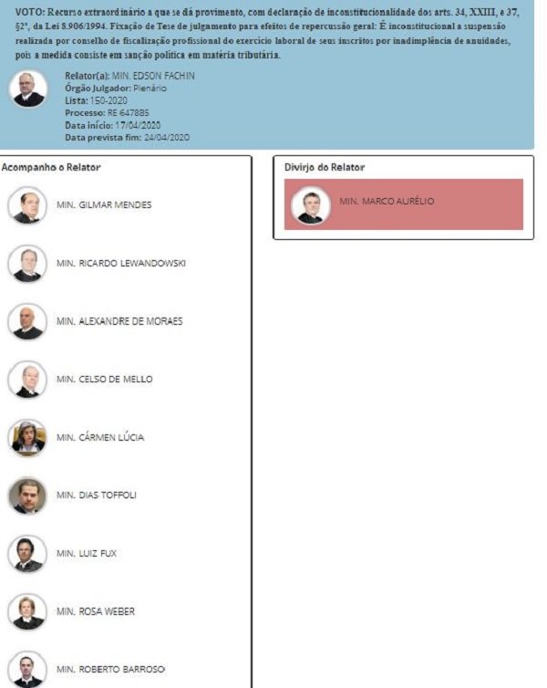 É inconstitucional a suspensão feita pelo conselho de fiscalização profissional do exercício laboral dos inscritos por inadimplência de anuidades, porque a medida é a sanção política em matéria tributária. Essa tese foi fixada em julgamento no plenário virtual do Supremo Tribunal Federal (STF). A decisão do colegiado foi por seguida após o voto do relator, ministro Edson Fachin. O ministro Marcos Aurélio foi o único a votar contrário a decisão.