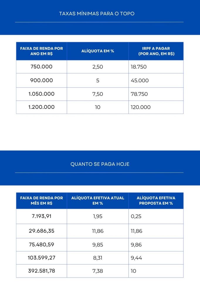 Assim, pessoas que ganham acima de R$ 50 mil por mês passarão a ser tributadas de forma progressiva com alíquotas de zero a 10%, sendo que a maior alíquota vai ser para quem recebe mais de R$ 1,2 milhão por ano.