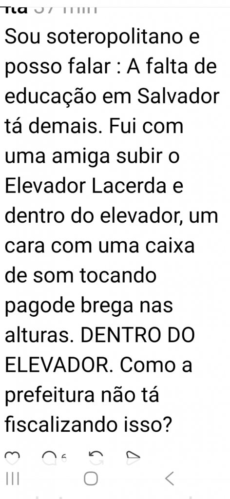 O escritor baiano Vinicius Oliveira, fez uma publicação na web, em que pede a fiscalização da Prefeitura de Salvador, no Elevador Lacerda. Ele testemunhou um passageiro com uma caixa de som na maior altura. Confira na íntegra: