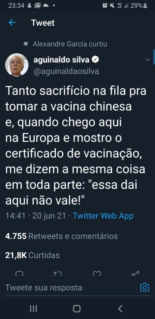 “Tanto sacrifício na fila para tomar a vacina chinesa e, quando chego aqui na Europa e mostro o certificado de vacinação, me dizem a mesma coisa em toda parte: ‘essa daí, aqui não vale’”, lamentou. Em uma resposta a um internauta que teria apagado o post, Aguinaldo rebateu: “Não, querido. O governo de São Paulo é que tinha a obrigação de informar que a coronavac só valia na Turquia, Síria e Paquistão”, disse no Twitter.