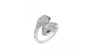 Anel Serpenti Seduttori ouro branco com 4 esmeraldas de pêra e cravação redonda em pavé (0,57 ct)