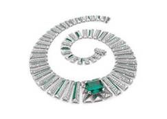Colar de alta joalheria em platina cravejado com elementos de madrepérola, 1 esmeralda quadrada (21,49 ct), 222 esmeraldas de topo polido (12,81 ct) e pavé de diamantes (20,95 ct)