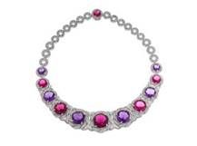 Colar da alta joalheria em ouro branco cravejado com elementos madrepérola, 6 rubelitas redondas (33,12 ct), 6 ametistas redondas (22,71 ct) e pavé de diamantes cravejados (5,10 ct).
