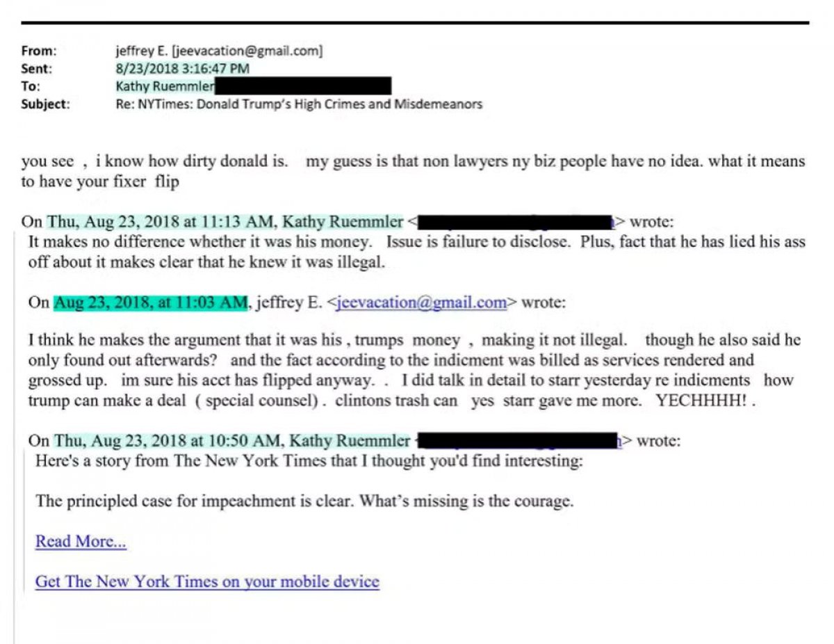 Em uma primeira resposta a Ruemmler, Jeffrey escreve que Michael Cohen acreditava que o dinheiro de Trump afastaria a questão da ilegalidade e ainda complementa escrevendo que conversou com Starr, provavelmente uma referência ao promotor Kenneth Starr, que o presidente conseguiria fazer um acordo.