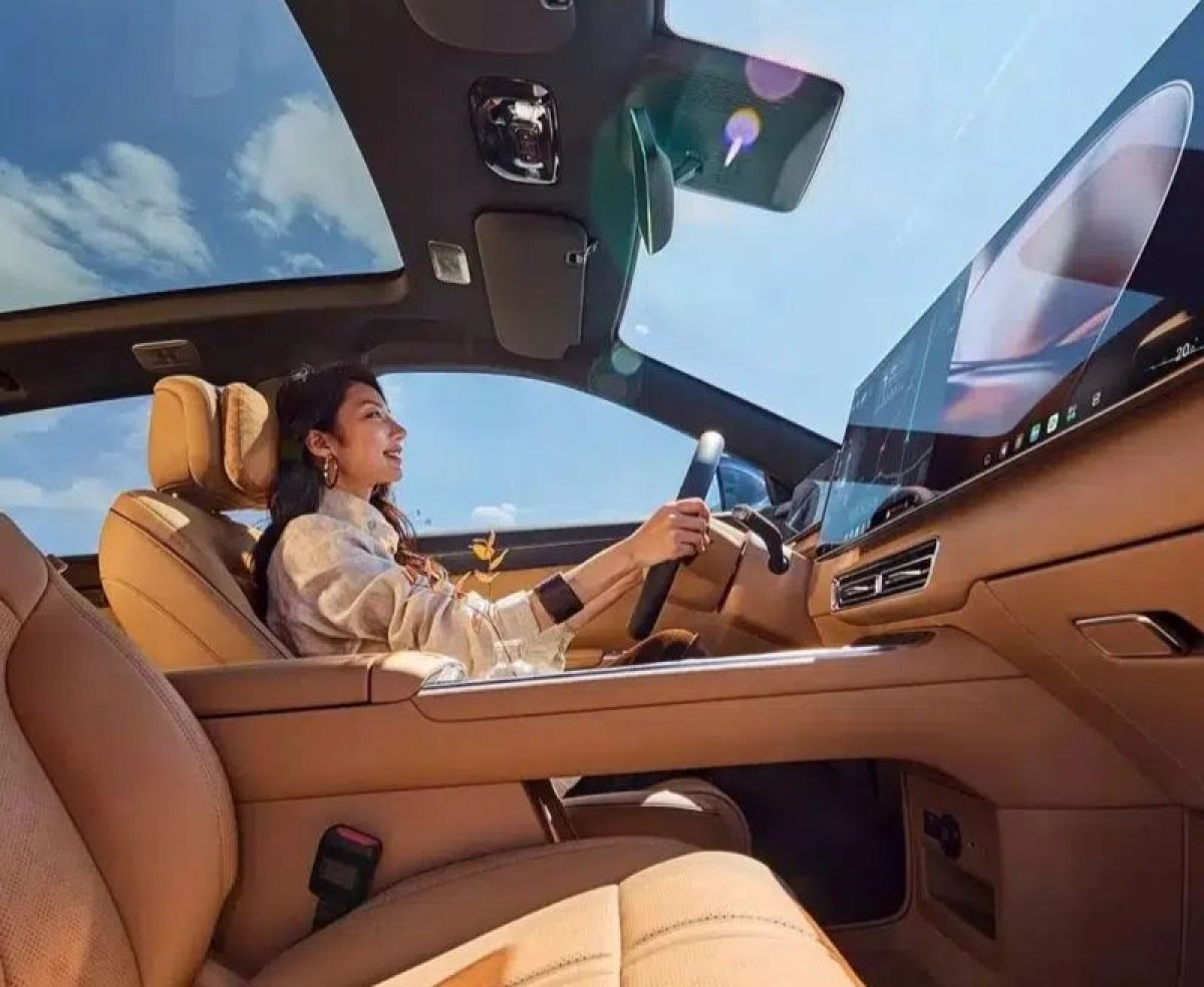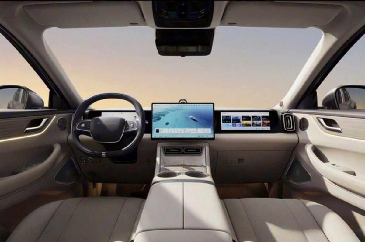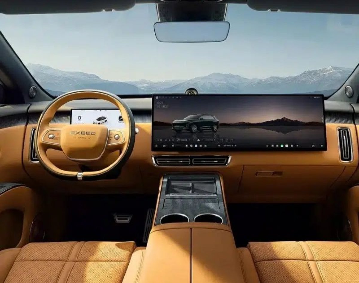 Por dentro, o EX7 adota um interior marcado pelo minimalismo e pela integração de telas. O painel concentra praticamente todas as funções em uma tela central de 30 polegadas, que reúne o sistema multimídia e os controles do veículo. O motorista conta ainda com um painel digital dedicado atrás do volante. O projeto reduz o número de botões físicos e reforça a tendência de interfaces digitais observada em carros elétricos premium. O acabamento utiliza materiais de aparência sofisticada e bancos com função de relaxamento, reforçando a proposta de conforto.