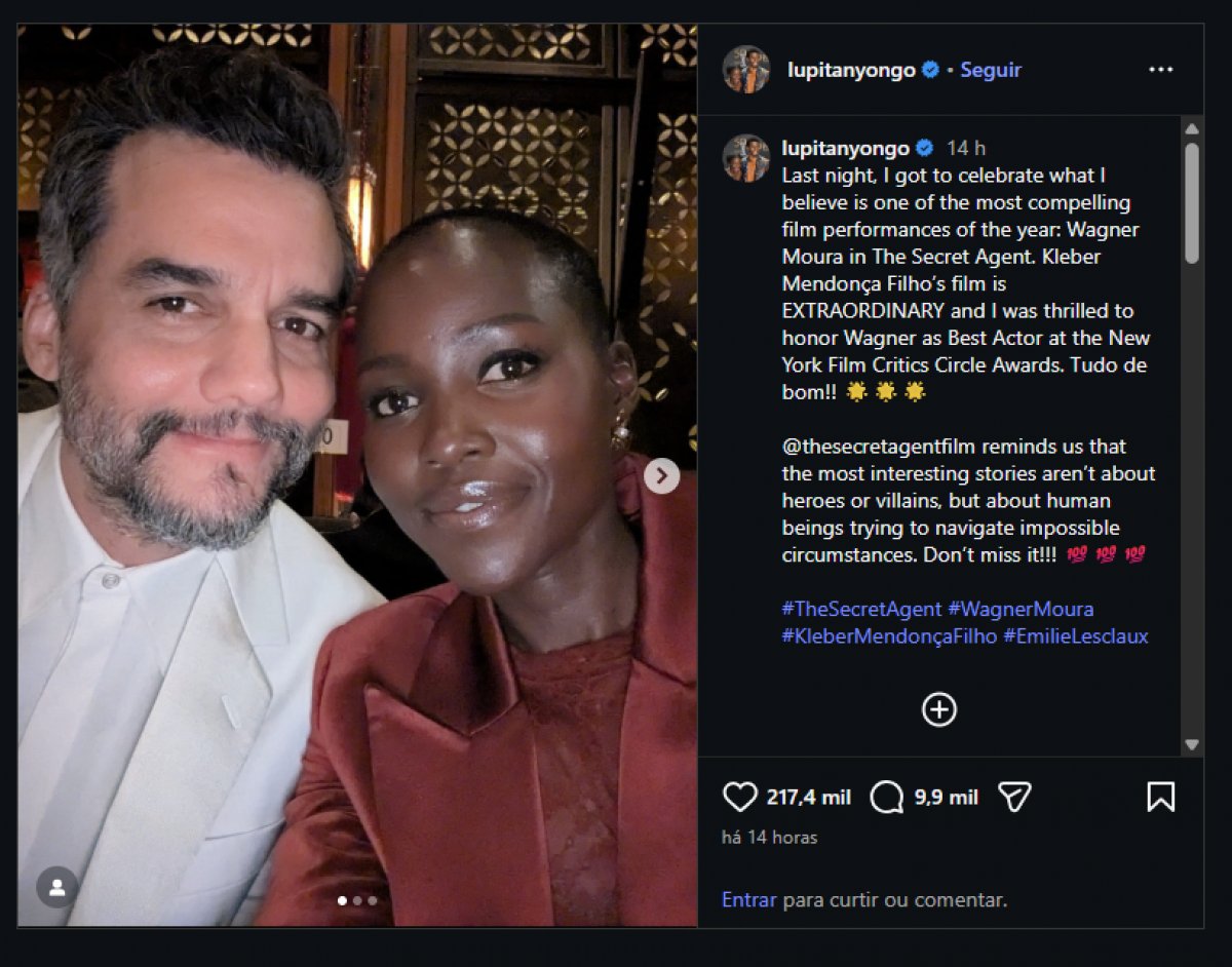 A atriz quênio-mexicana Lupita Nyong'o elogiou o trabalho de Wagner Moura no longa “Agente Secreto”, dirigido por Kleber Mendonça Filho.