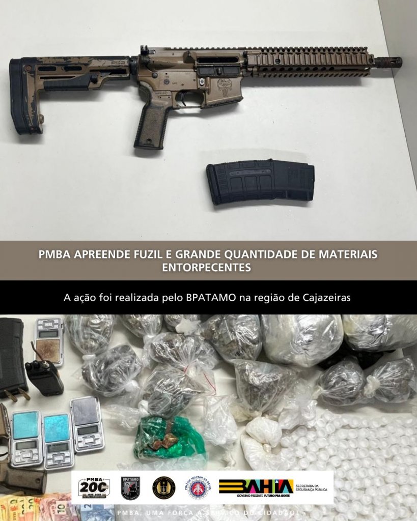 Um fuzil e entorpecentes foram apreendidos por agentes do  Batalhão de Patrulhamento Tatico Móvel da Polícia Militar da Bahia (BPatamo), na noite de sexta-feira (5), no bairro de Boca da Mata, em Salvador.