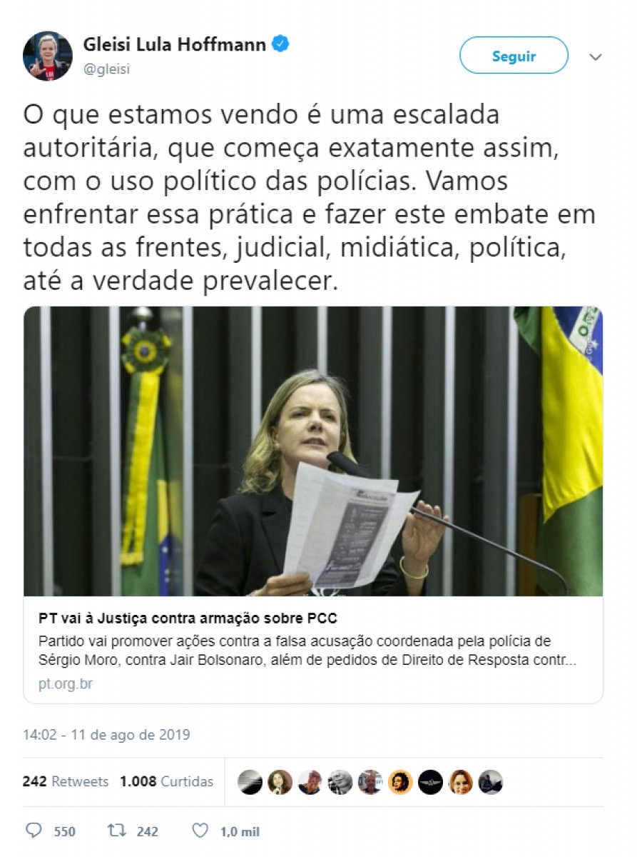 A pestista Gleisi Hoffmann, junto ao Partido dos Trabalhadores (PT) afirmou que vai entrar com uma ações judiciais contra o presidente Jair Bolsonaro e o ministro Sergio Moro, por conta do áudio interceptado pela Policia Federal (PF) em que um líder do PCC dizia manter diálogos com o PT.