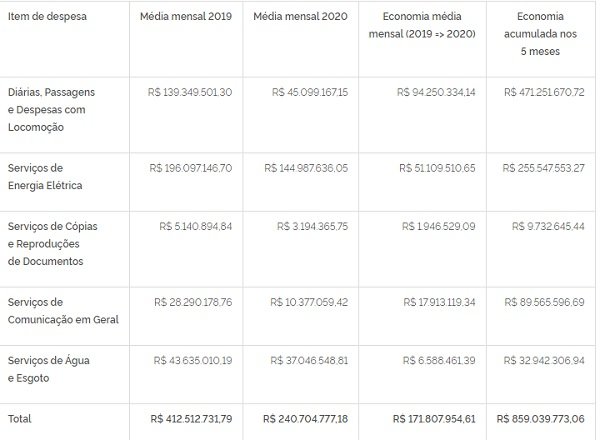 De acordo com uma tabela disponibilizada pelo ministério, é possível ver que apenas com diárias, passagens e locomoção foram economizados mais de R$ 471 milhões. A economia com energia elétrica foi de quase R$ 256 milhões. Os serviços de cópias de documentos também pouparam quase R$ 10 milhões de reais.