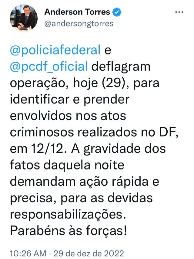Na publicação, o ministro também fez questão de parabenizar a Polícia Federal e a Polícia Civil do Distrito Federal, que atuam na operação em conjunto.