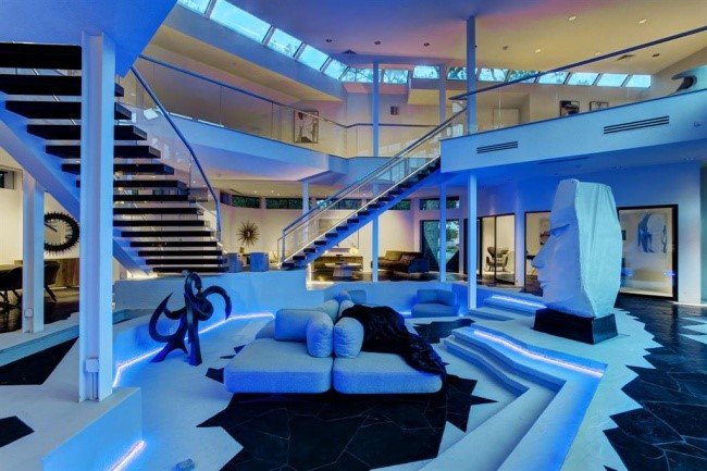 Erguida em um terreno de 1,6 mil m², a peculiar residência tem uma área construída de 650 m², contando com quatro quartos, cinco banheiros, salão de jogos, escritório, biblioteca, varandas e garagem para quatro carros, além de outros ambientes. Armários amplos, janelas enormes e iluminação em neon azul são outros destaques do imóvel.