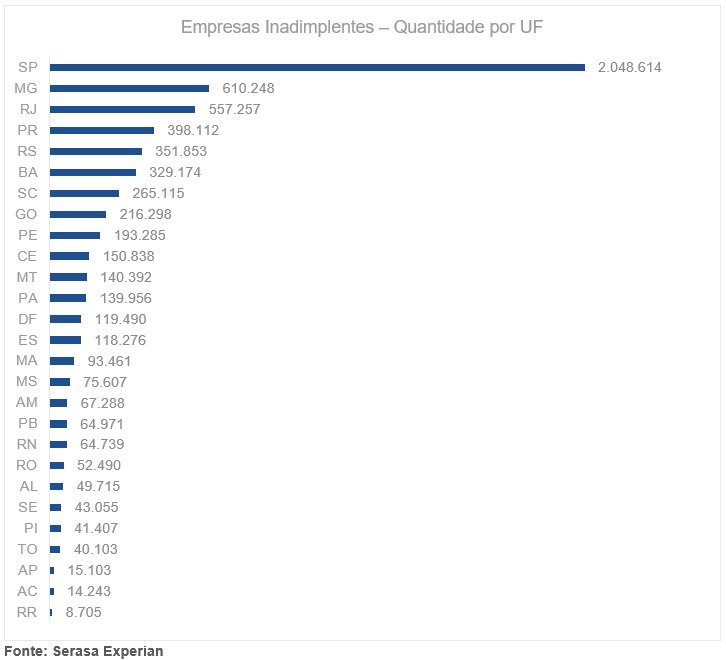 Na Avaliação por Unidade Federativa, o estado de São Paulo hospedou a maior fatia dos negócios com o nome no vermelho. Outras regiões que tiveram destaque foram Minas Gerais, Rio de Janeiro e Paraná. Veja no gráfico abaixo as informações na íntegra: