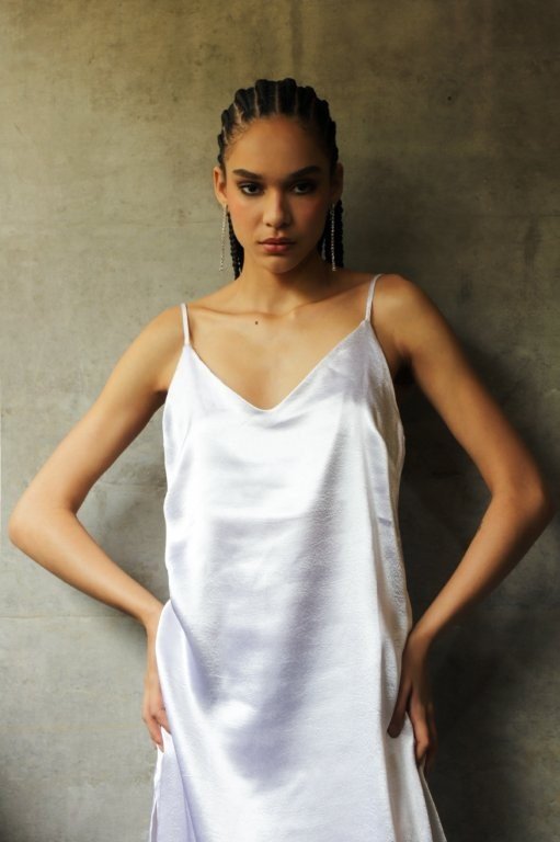 Nos tecidos acetinados, o brilho líquido do cetim reflete a essência de Lumina. Os vestidos Darya (um ombro só) e Yasmin (slip dress longo) são criações que impressionam sem esforço — leves, sutis e ideais para ocasiões especiais.