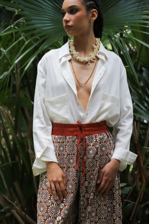 Entre os destaques do drop, o Vestido Naya Bordado surge em três versões — preto, argila e off-white, esta última sendo ideal para produções de Ano-Novo, mas igualmente versátil para festas diurnas, resorts e ocasiões despretensiosas. A silhueta fluida com corpo liso e saia bordada ganha movimento e um toque artesanal com a barra de franjas longas, criando um efeito sofisticado e único. Já a Calça Bordada Índia, também em off-white, foi desenvolvida para brincar com luz e textura, tem caimento leve, cós confortável e shape que já virou assinatura da Inglesis. É uma peça especial que se adapta tanto a ambientes casuais quanto sofisticados, resultando em um look monocromático luminoso quando combinada à camisa de seda