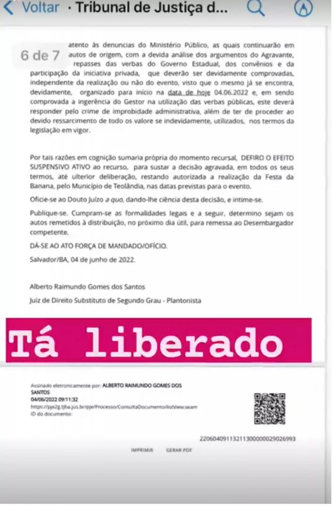 A Justiça liberou a realização da "Festa da Banana" em Teolândia, cidade localizada a 140 km de Ilhéus, no sul da Bahia, após a prefeitura recorrer de uma ação do Ministério Público da Bahia (MP-BA) que pedia o cancelamento. Na ação, o órgão afirmou que a região foi inundada pela chuva no fim do ano passado e ainda enfrenta dificuldades.