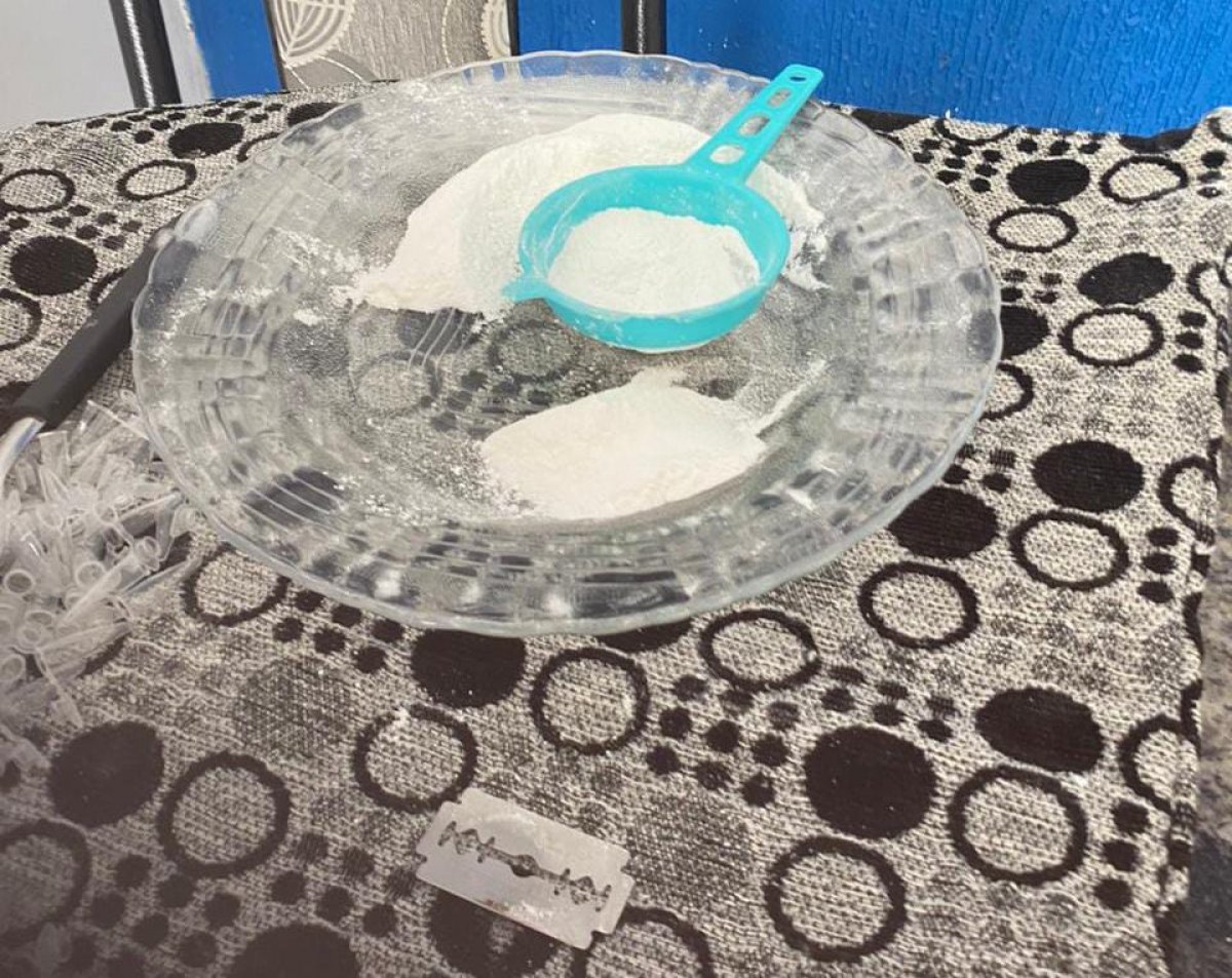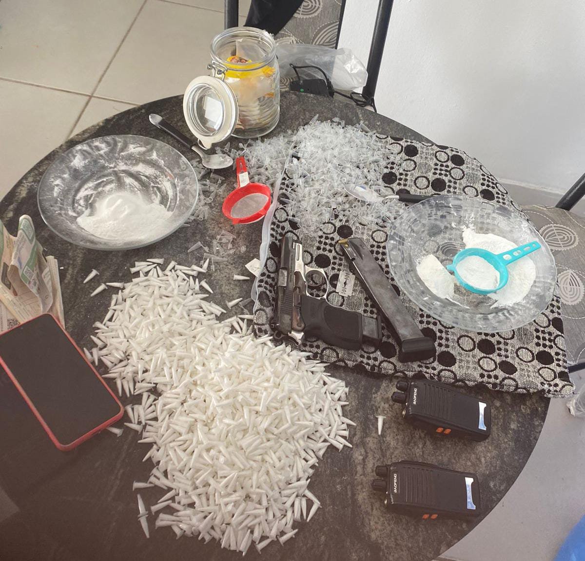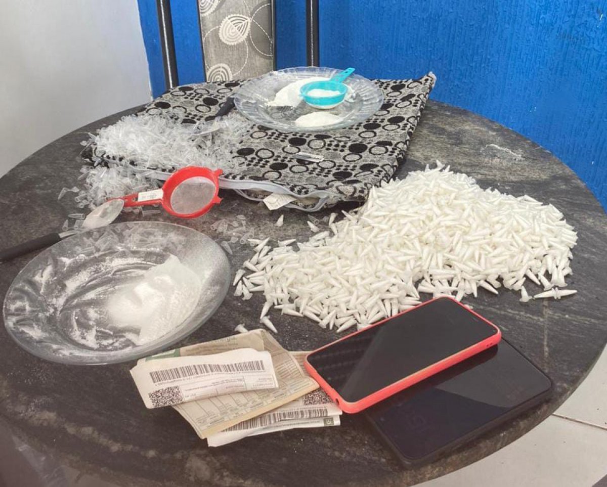 Os agentes também apreenderam um rádio comunicador, sistema de monitoramento por câmeras, dois aparelhos celulares, liquidificador industrial, balanças de precisão, materiais para embalagem, cadernos com anotações do tráfico, uma motocicleta e dinheiro em espécie.