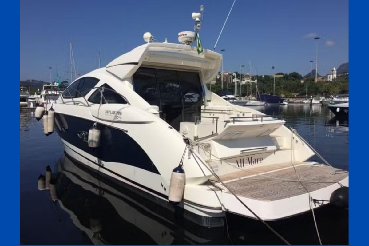 Lancha - a embarcação "all mare", será ofertada com lance inicial de R$ 1,1 milhão. A lancha tem 15,5 metros de comprimento, foi construída com fibra de vidro e conta com dois motores de 435 cavalos cada um. Atualmente, a embarcação está ancorada na Marina da Glória.